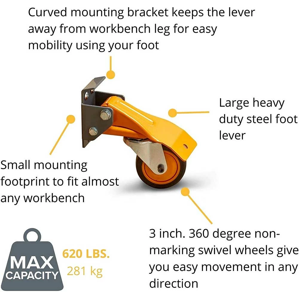 - Each wheel has a 155 lb. weight capacity — up to 50 lbs. more per wheel than most other caster kits