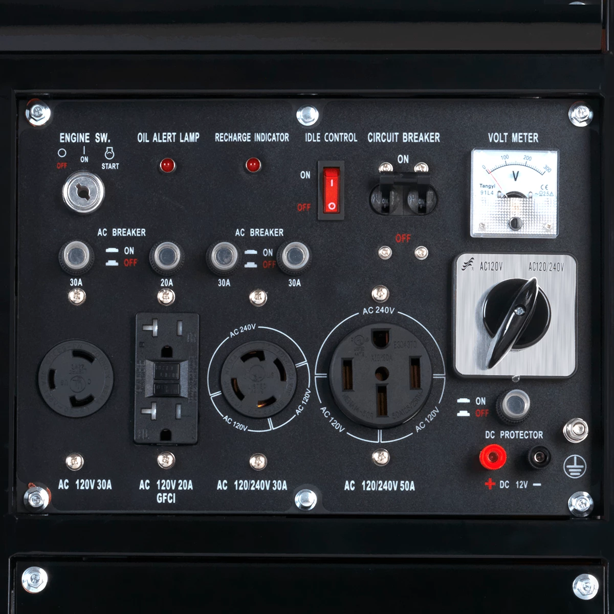- Full power panel with oil warning light, volt meter, circuit breaker and power outlets.