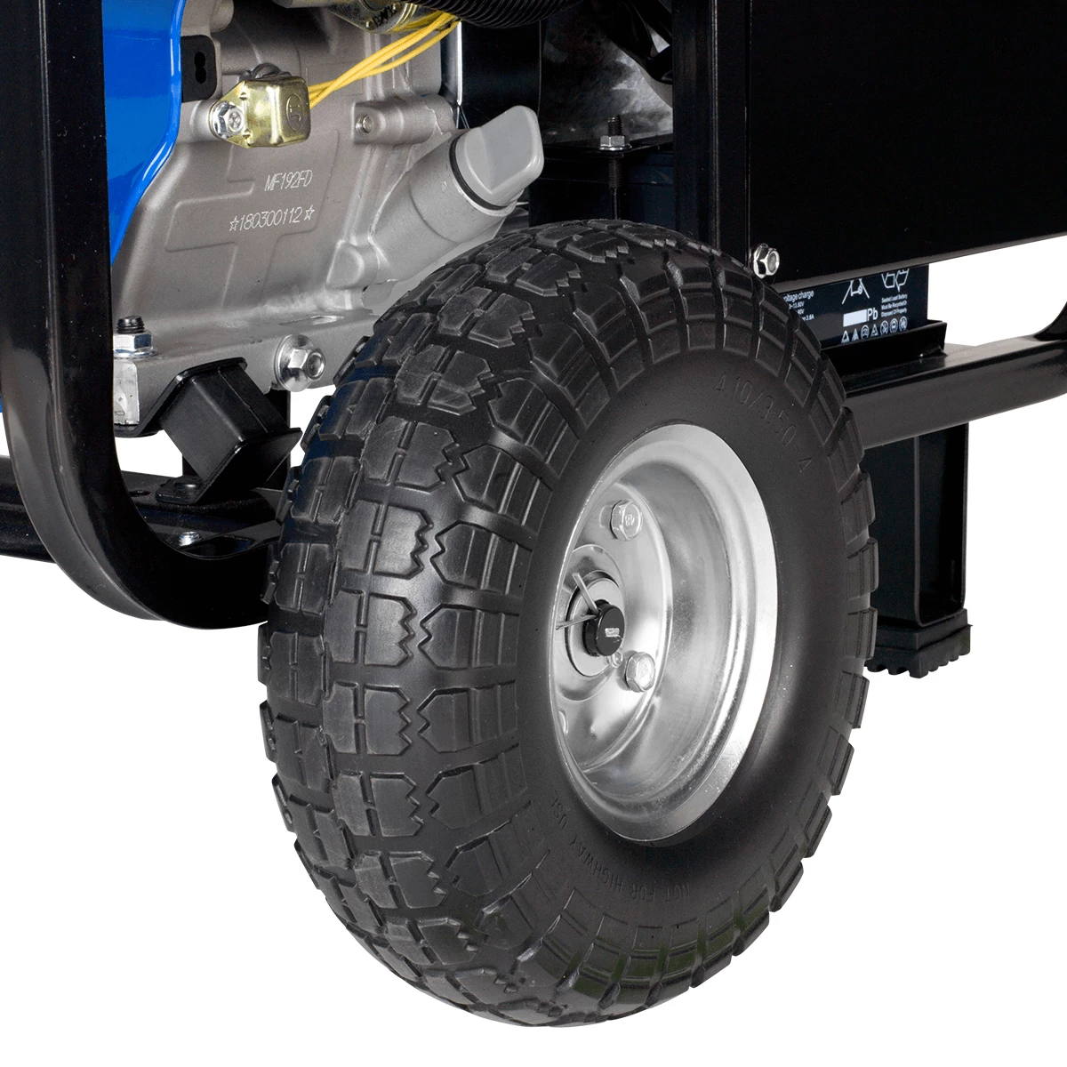Designed for Safe and Easy Operation, the XP10000E features a user-friendly, Electric Start, that’s as simple as starting your car. It is also equipped with a recoil start in case of the battery being drained. Solid-Fill tires are also standard, they will never run flat, and high leverage handles that make it easy to transport over every terrain. The attached oversized noise reducing Muffler has a built-in Spark Arrestor for safe use in mandated camping areas and jobsites.