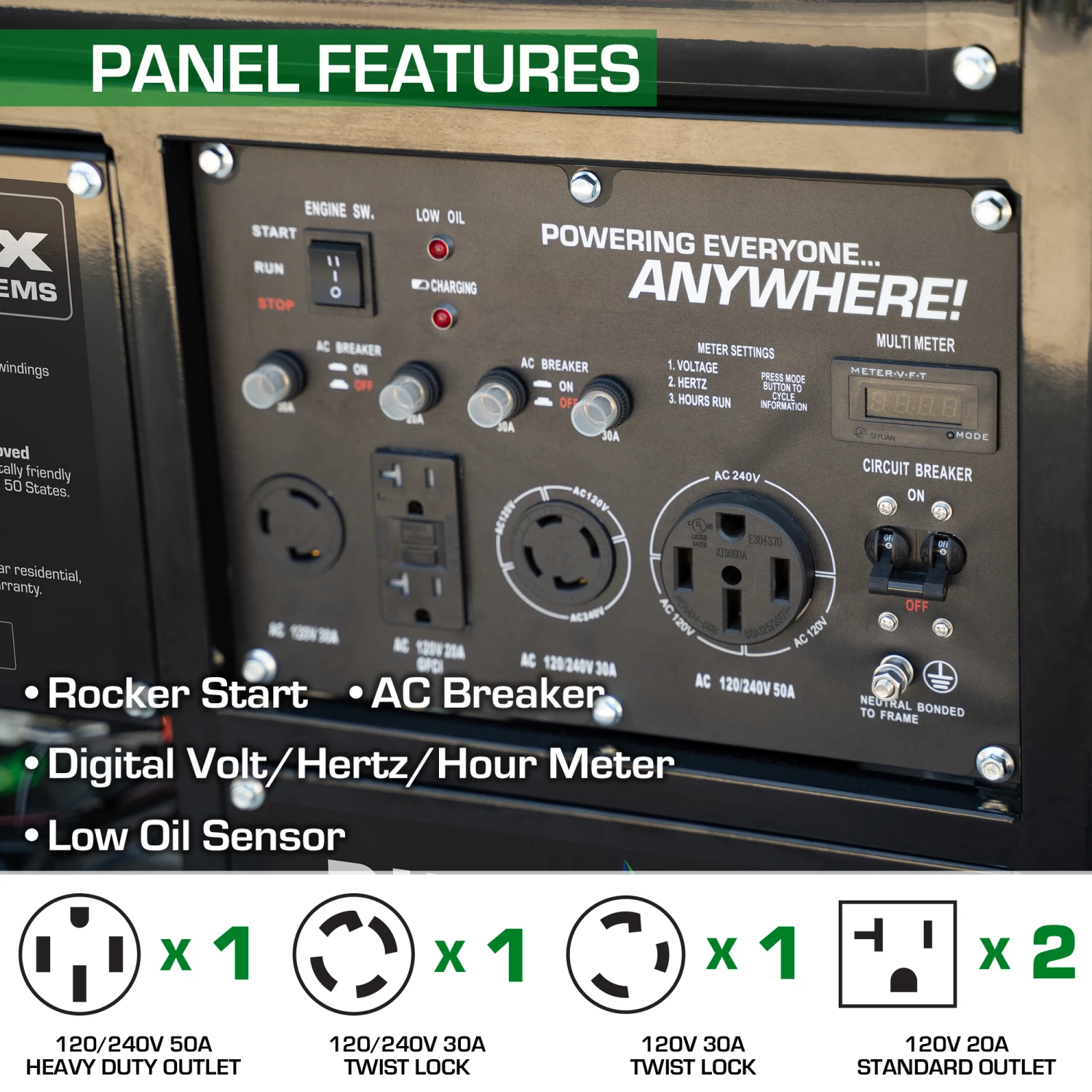 - Fully Featured Power Panel – The power panel includes a wide selection of outlets for maximum compatibility in your applications including: 2 120V household GFCI outlets, 1 120V 30A twist lock outlet, 1 240V 30A outlet, and one 240V 50A outlet. The panel also includes a digital voltmeter.