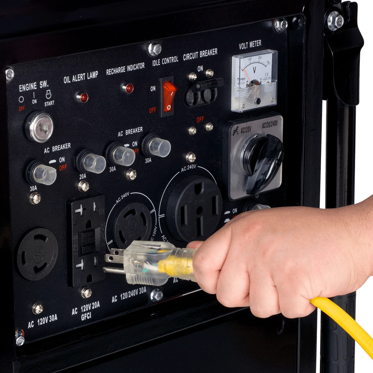 generator when an unsafe level of carbon monoxide is detected. - FULLY LOADED POWER PANEL: This generator comes equipped with four 120V 20AMP GFCI outlets, one 120V 30AMP twist lock, one 120 / 240V30AMP twist lock, and one 120 / 240V 50AMP heavy-duty transfer switch-ready outlet. Includes individual circuit breakers, idle control, and a low oil sensor.