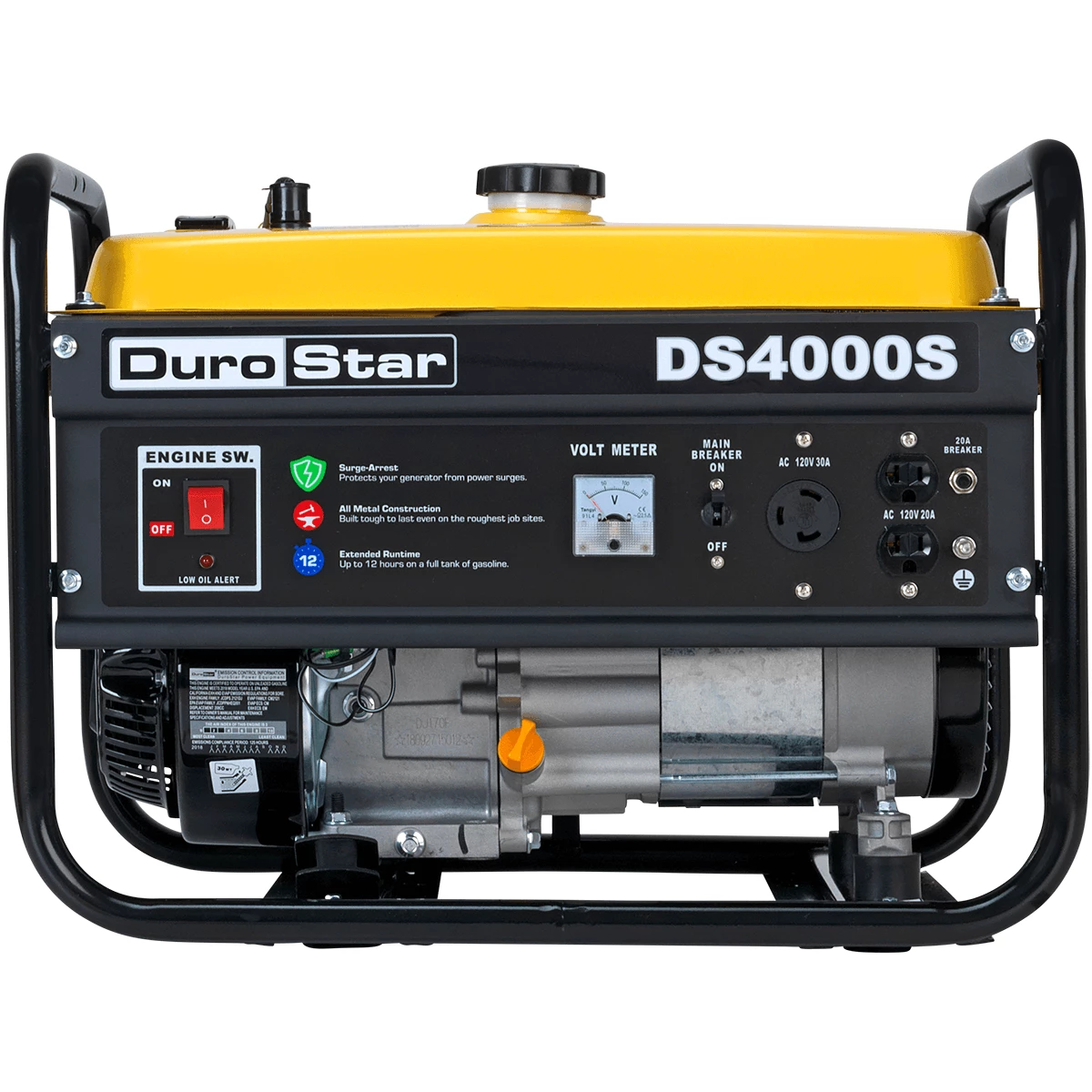 The DuroStar DS4000S 4,000 Watt Generator is designed by the professional, for the professional. It features a Fully Loaded Power Panel that is the main control center for the Generator. The Power Panel also has the Engine Shutoff switch, Volt Meter, and Circuit Breakers. These units are EPA approved for safe use in U.S. National Parks and mandated Jobsites. The Powerful Durostar Engine is Air Cooled and can withstand use and abuse. This Generator has everything a Great Generator needs, but at a price that everybody wants. This DuroStar Workhorse can operate anything from Air Compressors, Air Conditioners to Basic Home Power (lights and fridge). The DS4000S is a tried and true piece of equipment. It is well worth it’s weight in gold; as soon as the box is opened you will be amazed at the amount of thought and science that was put into designing this unit. No corners have been cut in the manufacturing or assembly of these units. The DuroStar DS4000S unit features an Air Cooled Engine and is designed with a Low-Oil Shutoff Sensor to protect the Motor. Built to offer more power and longer lasting durability, The DuroStar DS4000S Generator has a Cast-Ironed Sleeved, 208cc Engine rated at delivering a peak of 4,000 surge watts / 3,300 Constant. This is a sufficient amount of power that can handle an overhead Air Conditioner in a RV to basic house power. Designed for Safe and Easy Operation, the DS4000S features a user-friendly, Recoil Start, that’s easier than starting a lawn mower. The attached oversized noise reducing Muffler has a built-in Spark Arrestor for safe use in mandated camping areas and jobsites. This unit can be tossed around on the jobsite or truck mounted for maximum security. All DuroStar Generators are user friendly and are ready to use out of the box within minutes. Simply remove all packaging, add Oil and Gas and it is ready to begin producing power.