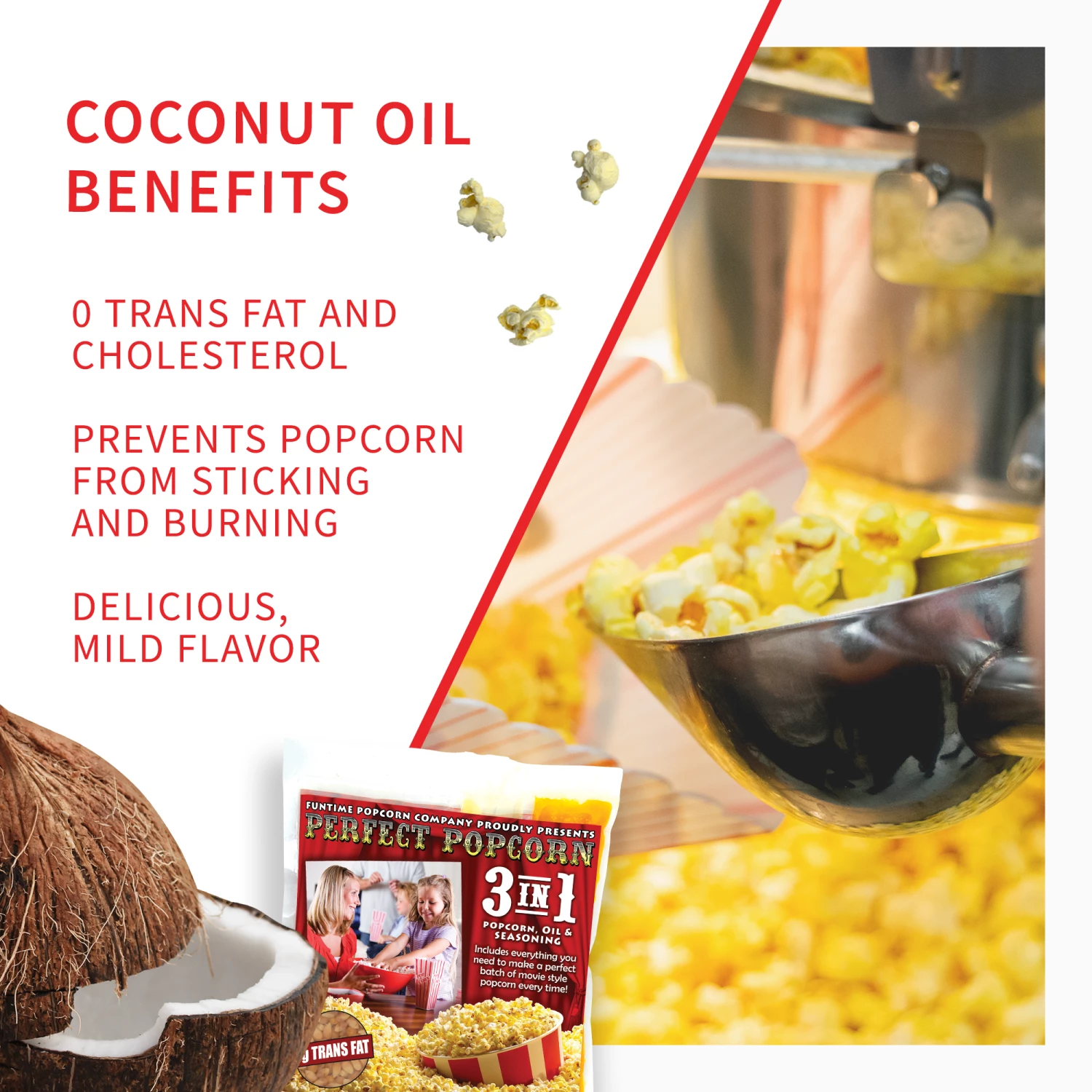 - Our unique variety of corn is grown right here in the US. It pops up large and fluffy, with almost no unpopped kernels. Another secret is the use of pure healthy coconut oil. Coconut oil has the ability to pop the kernels quickly without burning, sticking to the kettle or adding any unwanted flavors, not to mention all of its health benefits. Each 3 in 1 pack includes a delicious blend of seasonings, just the right amount of salt, and that amazing blast of buttery goodness.