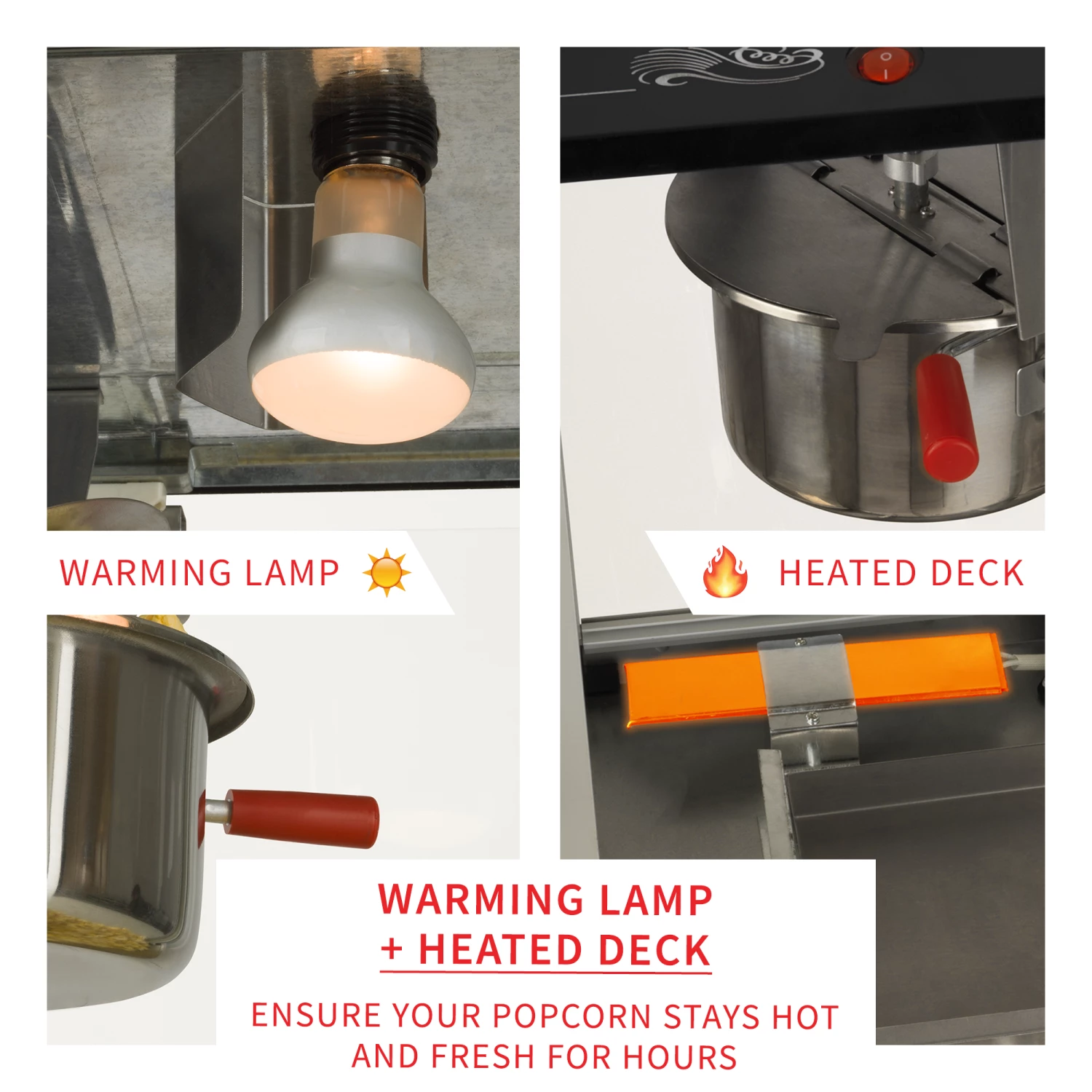 - WARMING LIGHT & HEATED DECK: Keeps the interior of the machine at a constant temperature to ensure your popcorn stays hot and fresh for hours.