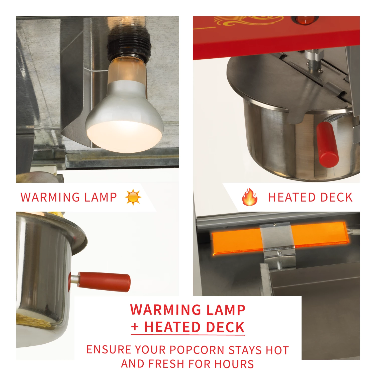 - WARMING LIGHT & HEATED DECK: Keeps the interior of the machine at a constant temperature to ensure your popcorn stays hot and fresh for hours.