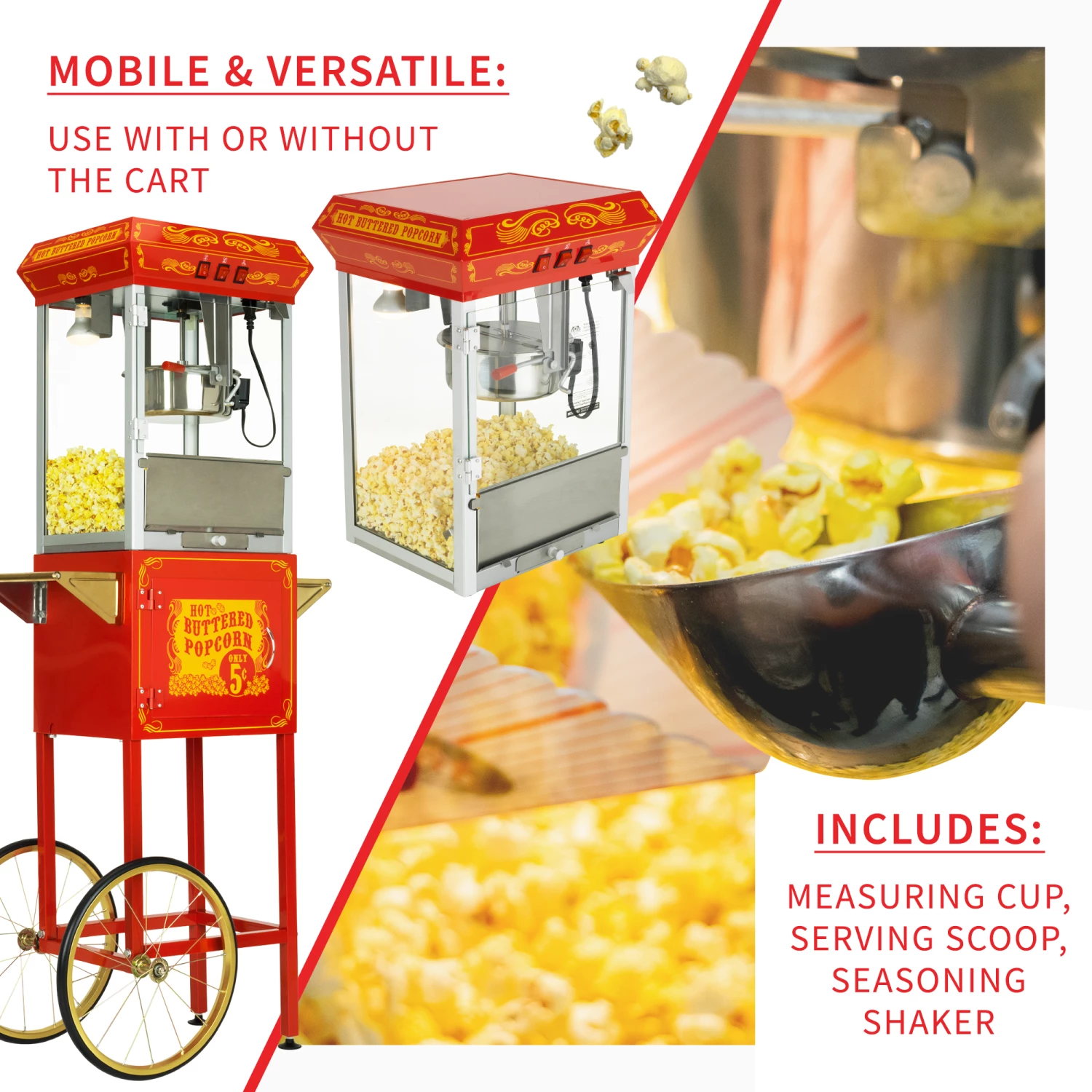 - BUILT FOR MOBILITY & VERSATILITY: Large, bicycle-style wheels allow for smooth mobility and easy portability. This model can be used with or without the cart — the popcorn machine is detachable and can be placed on counters and bar/tabletops.