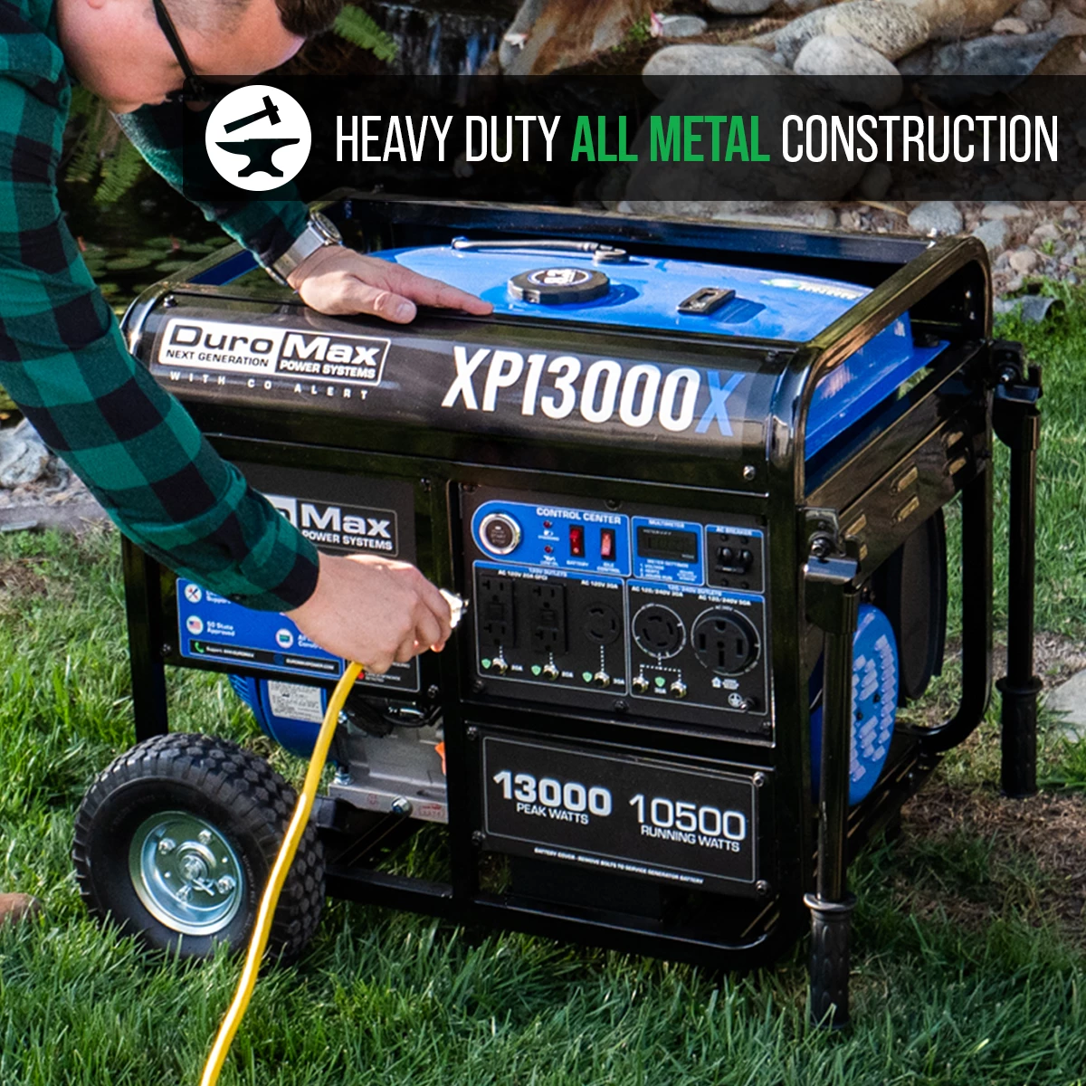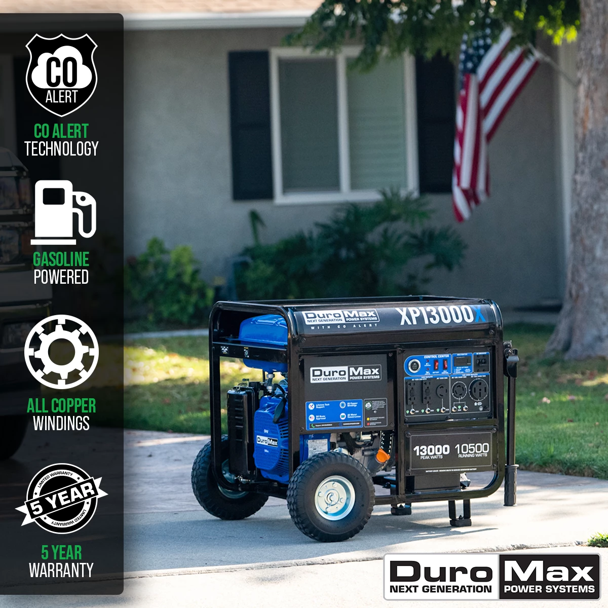 The XP13000X is the largest and most powerful gasoline generator in the X Series, with 13,000 peak watts and 10,500 running watts. Powered by our DuroMax 500cc OHV engine, this generator is the PERFECT HOME POWER BACKUP solution and will run your household essentials such as lights, appliances, and central AC system with EASE during a blackout, storm, or emergency event.