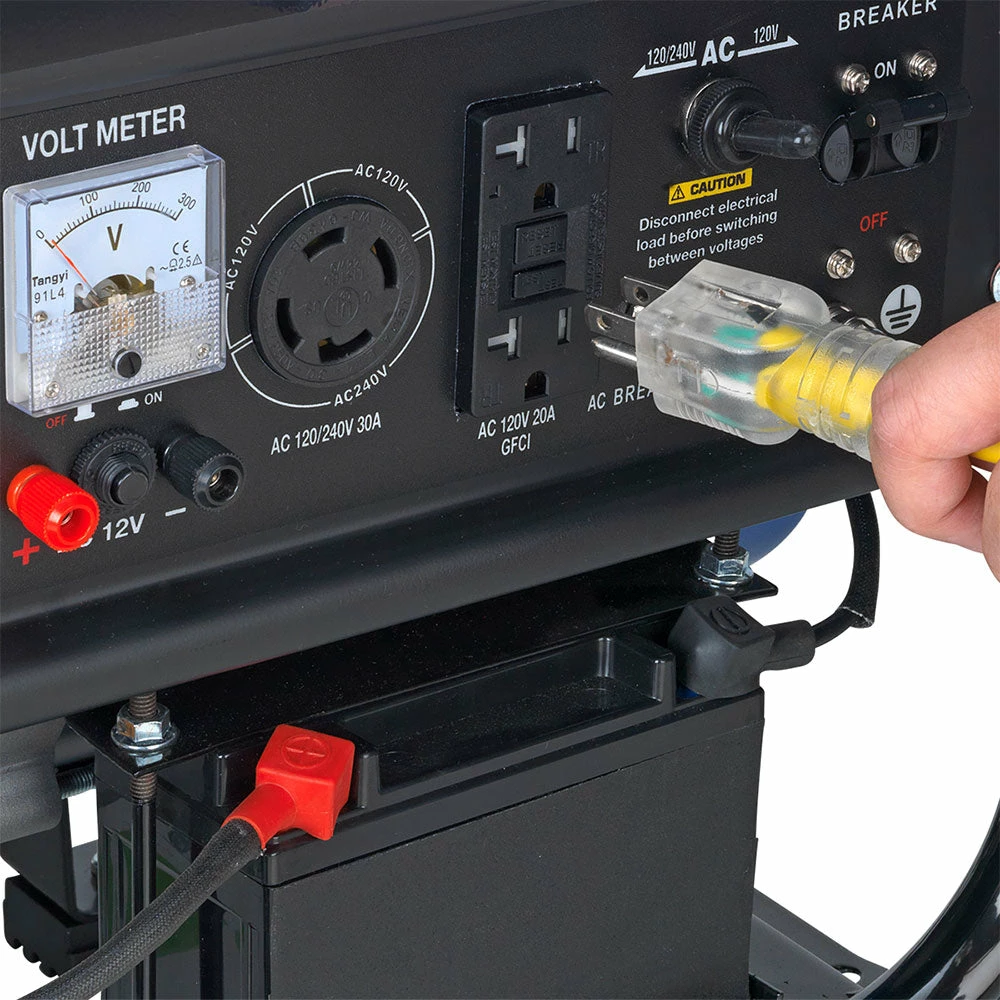 - Fully Featured Power Panel – The power panel includes a wide selection of outlets for maximum compatibility in your applications including: 2 120V household GFCI outlets, and 1 120/240V 30A twist lock outlet. The panel also includes a voltmeter and 12V DC charging posts for charging external batteries.