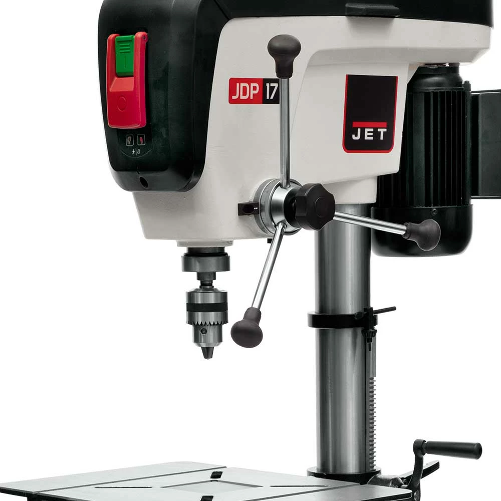 - Introducing the new JET JDP-17, 17 Drill Press. From a full 5 of spindle travel to the sturdy cast iron head with a poly v-belt drive system, this drill press is designed to perform. This drill press also features a long-lasting, built-in LED work light to provide direct lighting while reducing shadows. A large 14 x 19 work table provides plenty of support with an edge designed for easy clamping.
