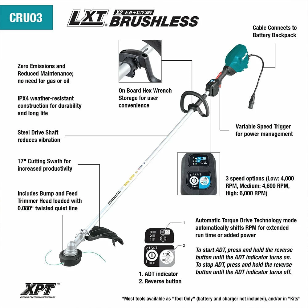 - Makita-built BL Brushless Motor delivers power equivalent to a 30cc gas string trimmer