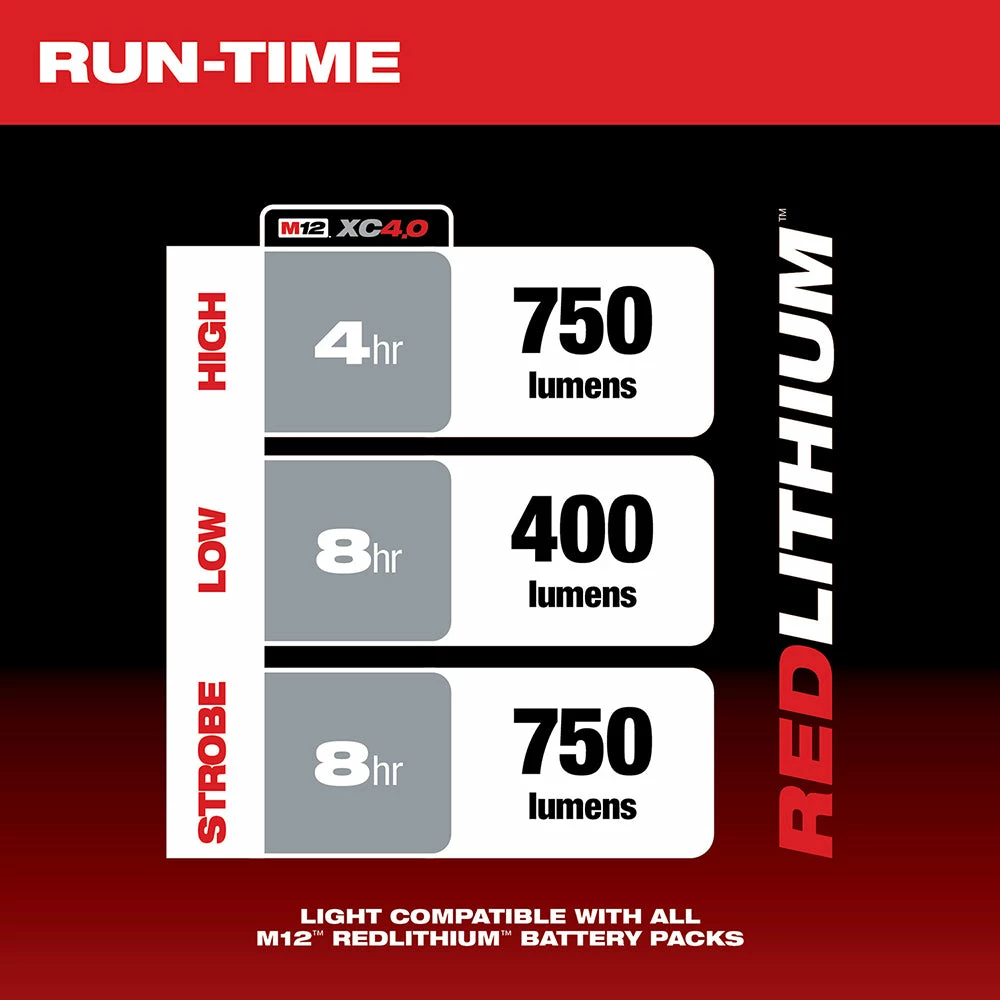 - High Mode: 750 lumens for up to 4 hours with M12 XC 4.0 Pack
