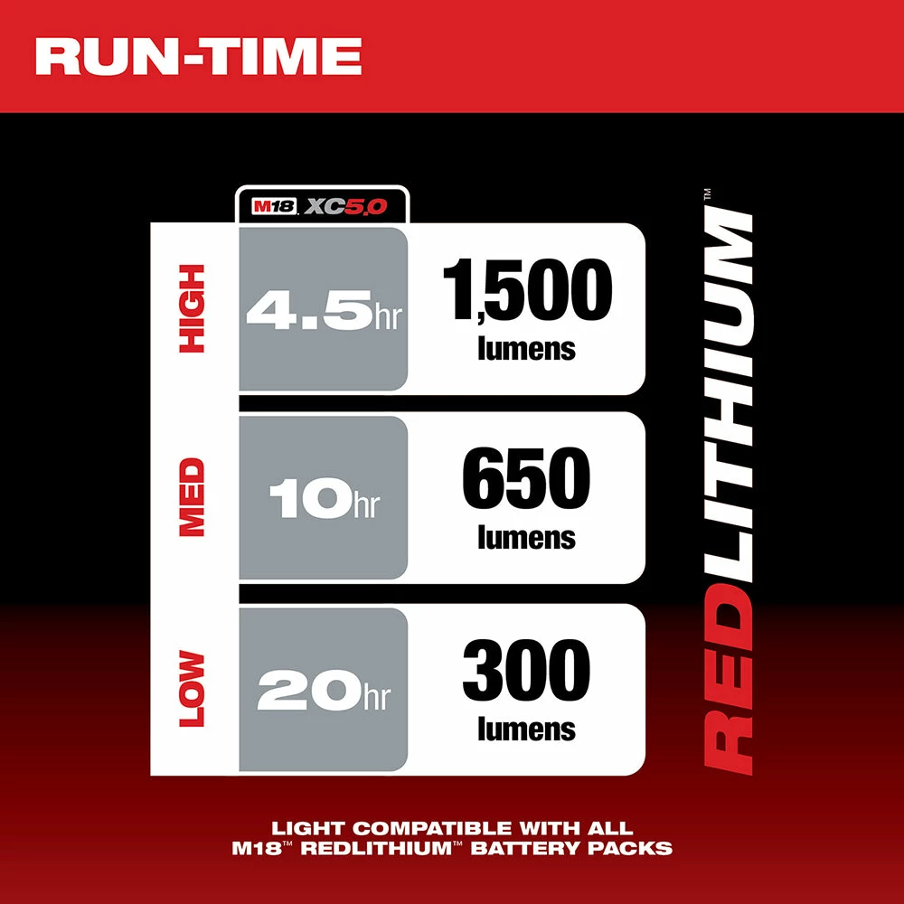 - High mode: 1500 Lumens for up to 4.5 hours with M18 XC 5.0 Battery