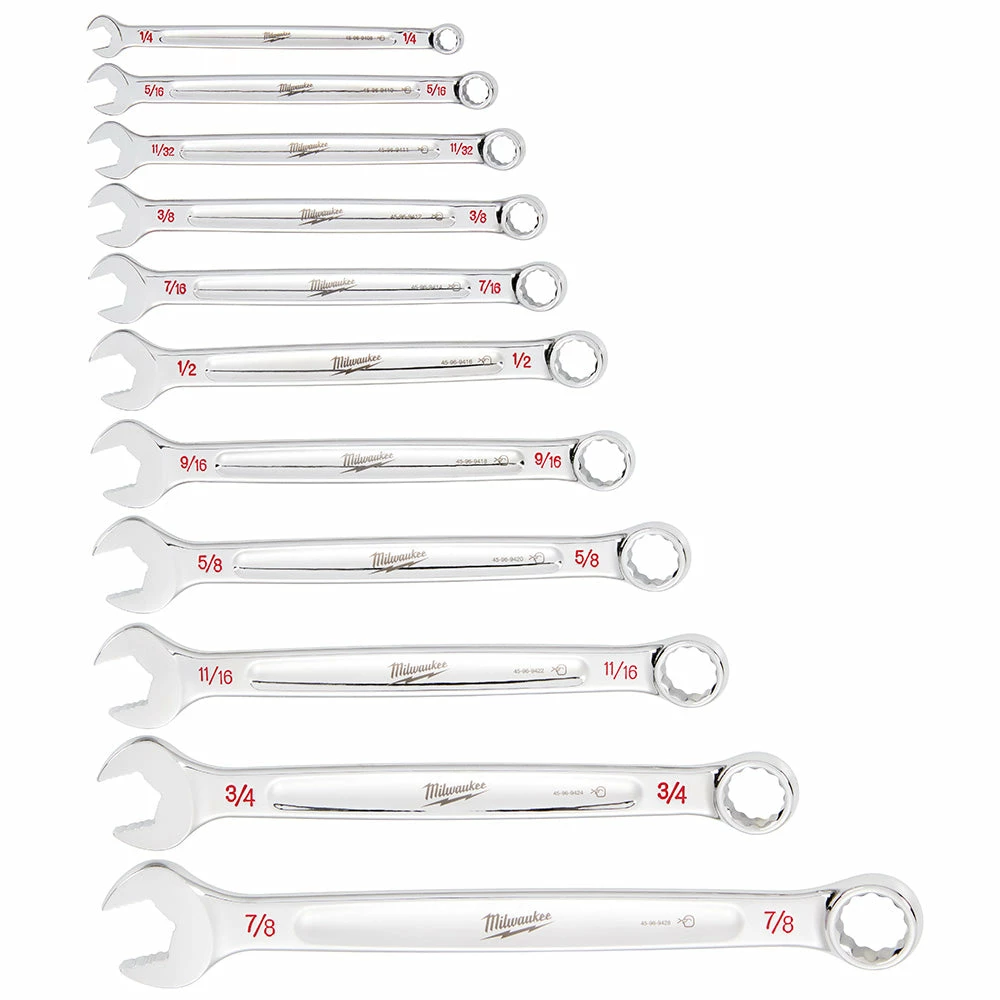 - 1/4″, 5/16″, 11/32″, 3/8″, 7/16″, 1/2″, 9/16″, 5/8″, 11/16″, 3/4″, 7/8″ Combination Wrenches