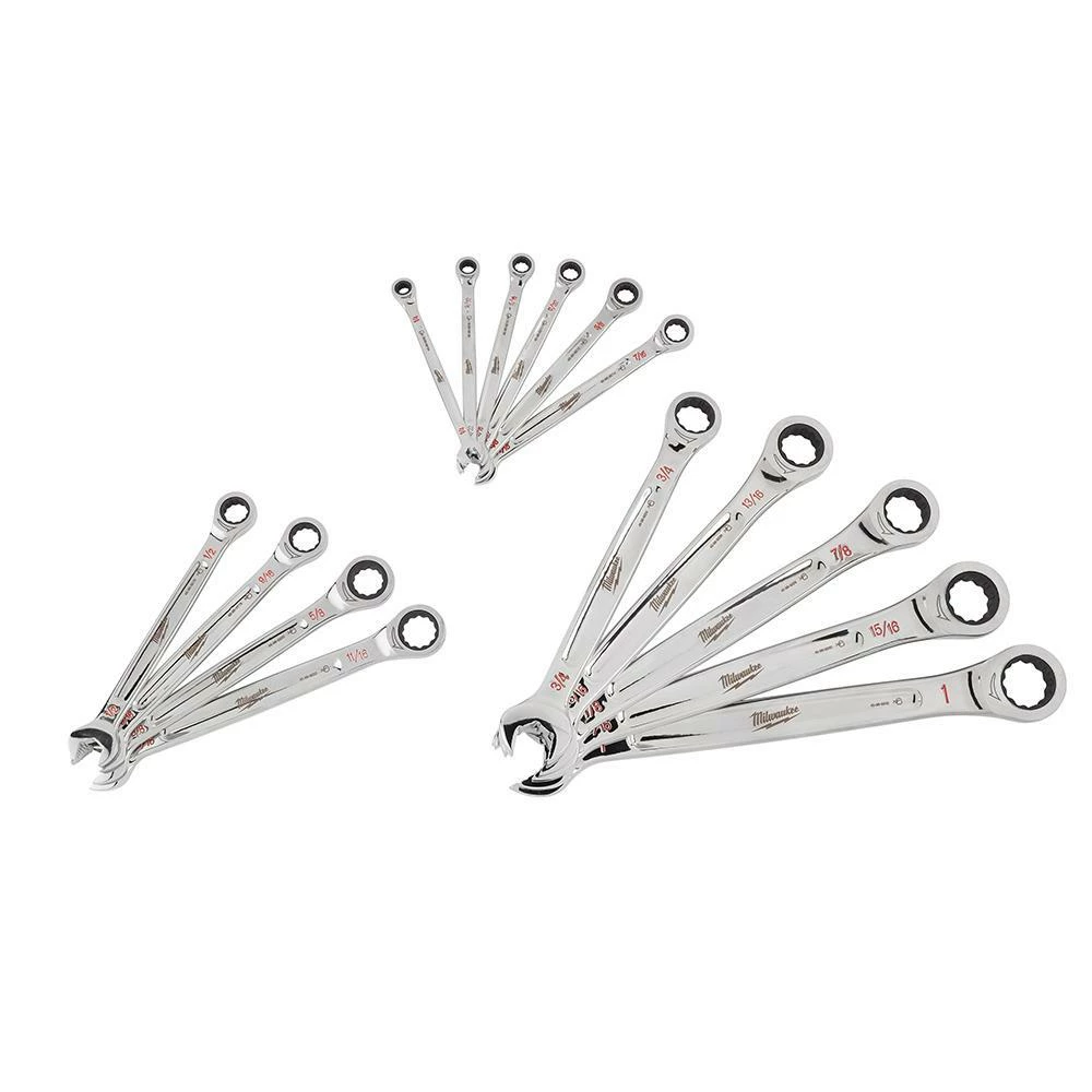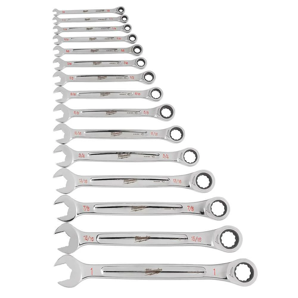 - Milwaukee 1/4, 9/32, 5/16, 11/32, 3/8, 7/16, 1/2, 9/16, 5/8, 11/16, 3/4, 13/16, 7/8, 15/16, 1-Inch Ratcheting Combination Wrench – 48-22-9416