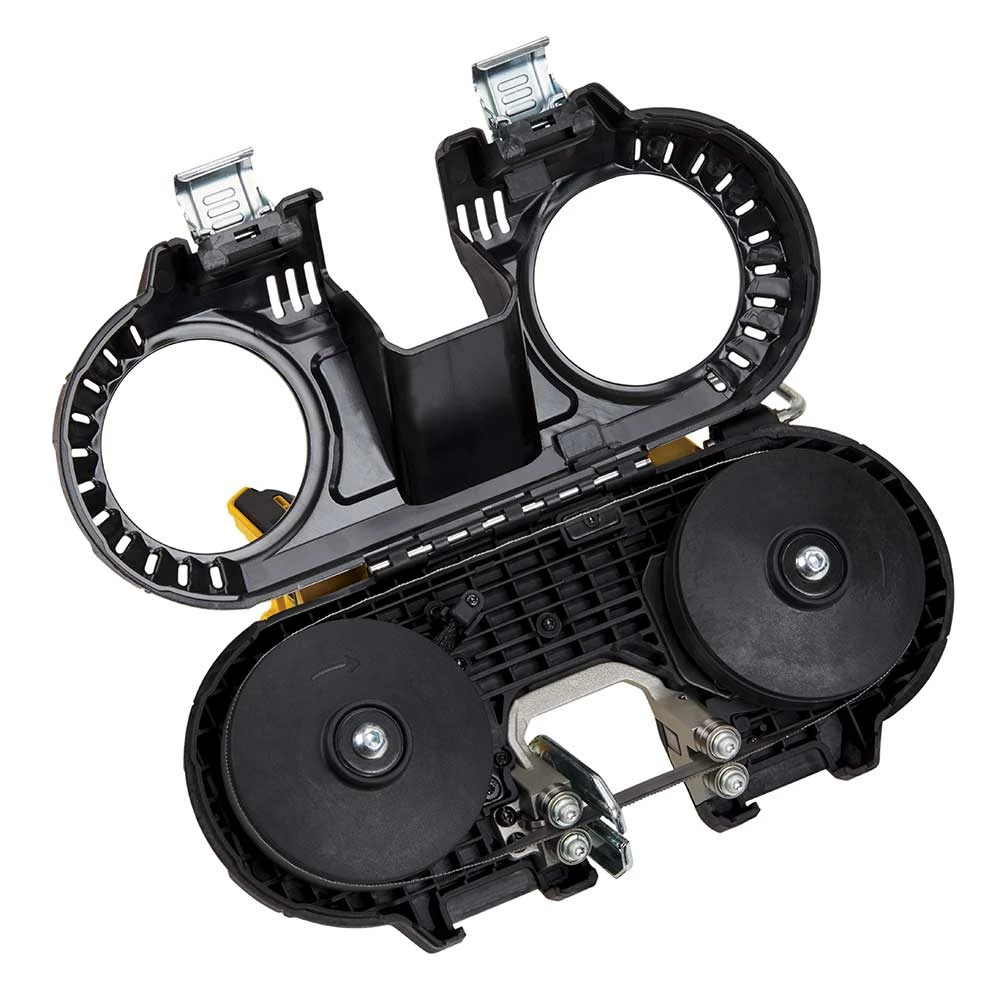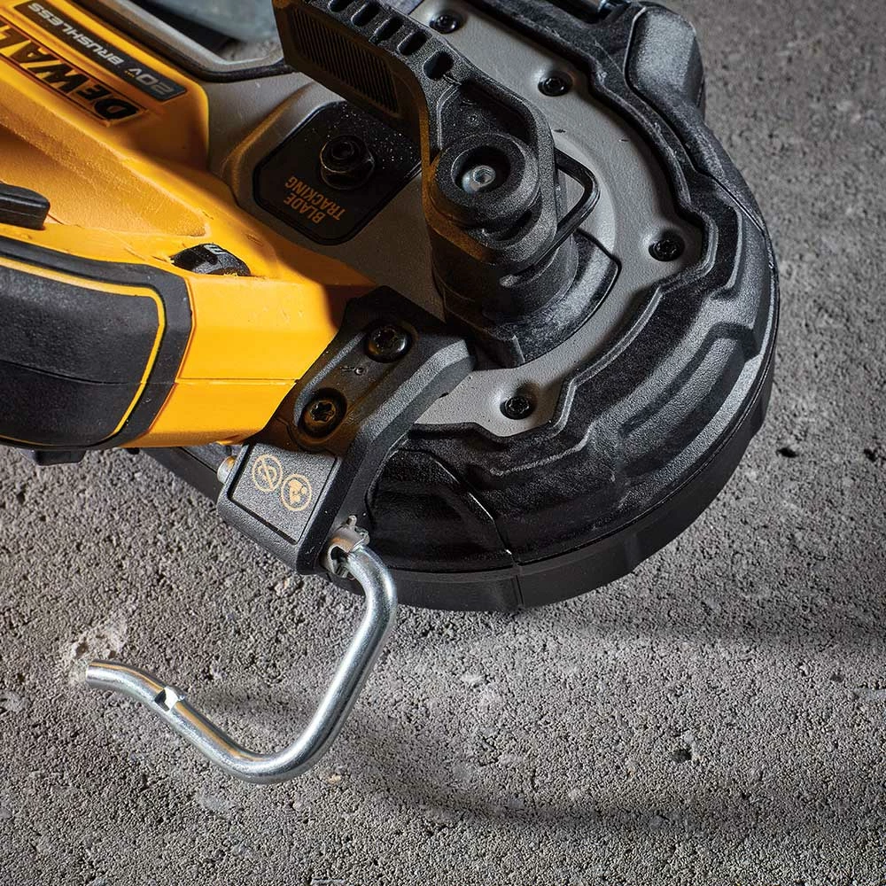 - Blade release lever with a wrench and single-point tracking adjustment.