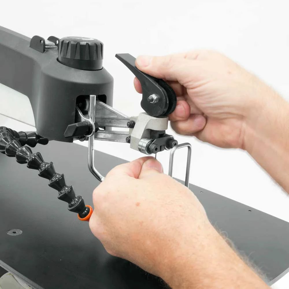 - Upper blade holder clamps and tensions blade in one step (Patent Pending)